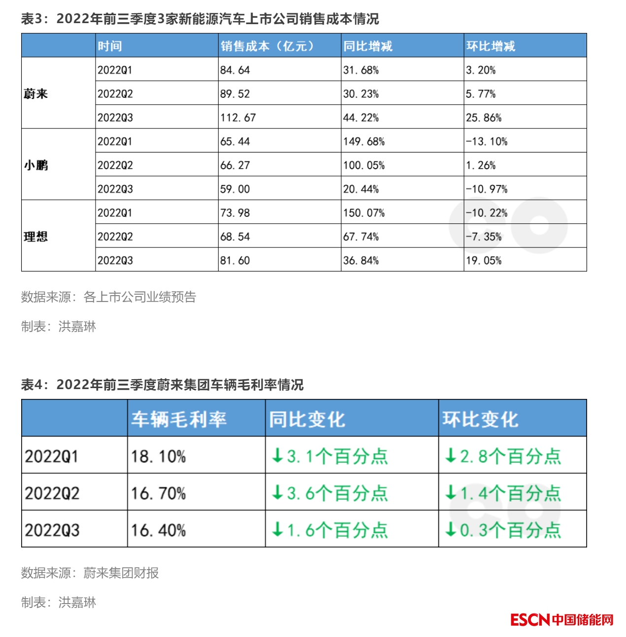 蔚來集團財報顯示,2022年第三季度其銷售成本為112.67億元,較2021年第三季度增長44.2%,主要原因是汽車交付量增加和單車電池成本增加。2022年一至三季度,蔚來集團的季度車輛毛利率同比和環(huán)比均出現(xiàn)下滑,單車電池成本增加仍是重要原因。