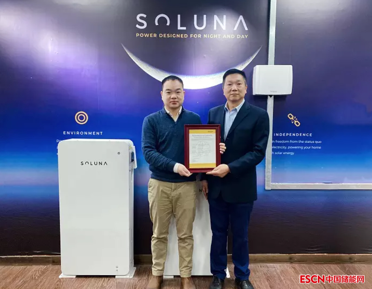 Intertek電子電氣華東北區(qū)總經(jīng)理金志斌先生(右)為Soluna總經(jīng)理郭康先生(左)頒發(fā)UL 9540A證書