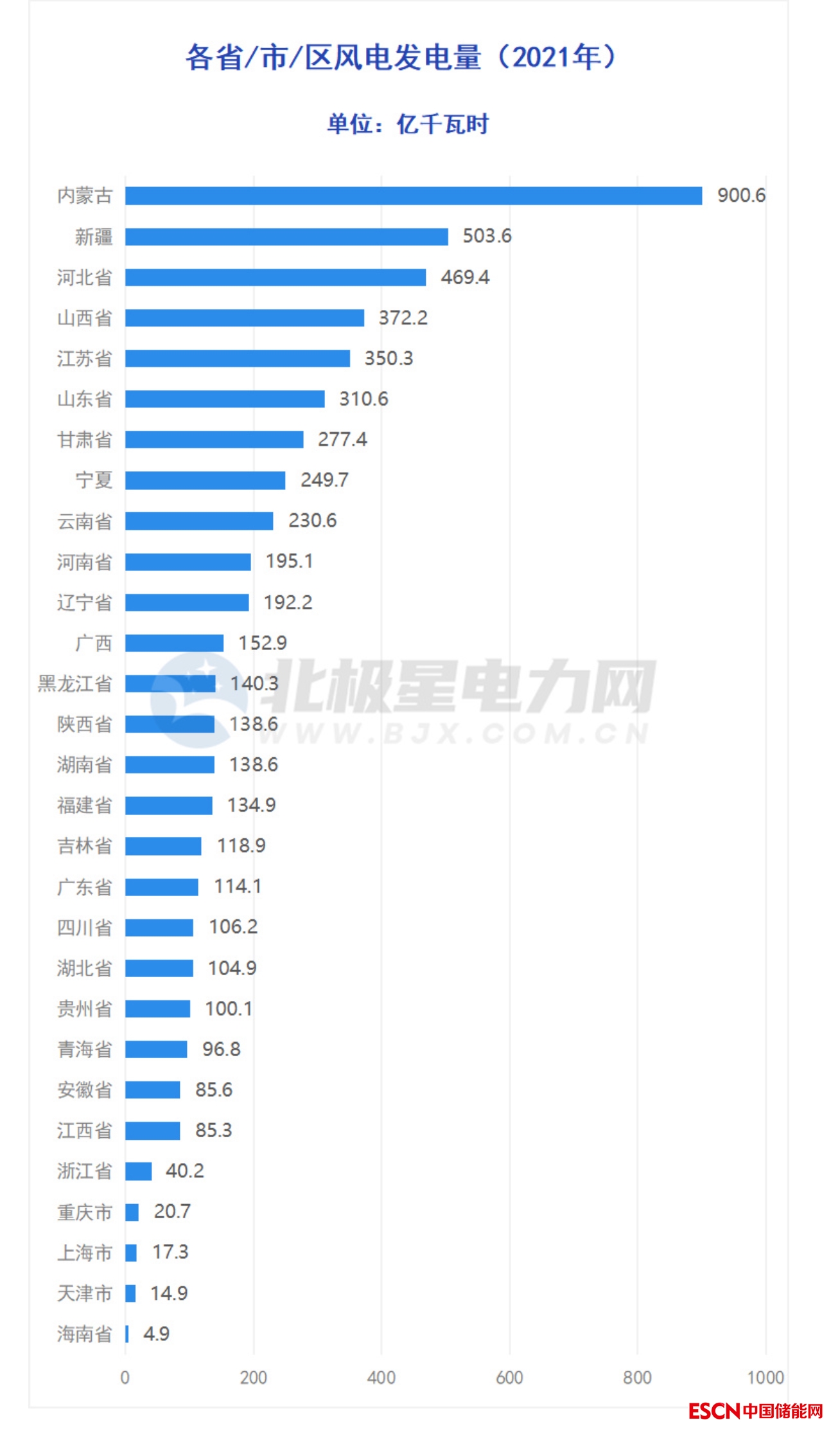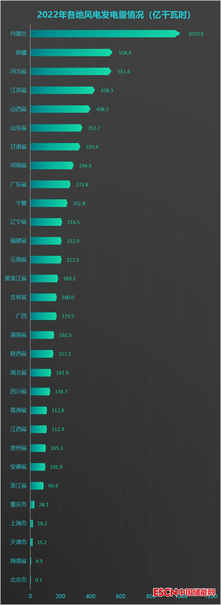 中國儲能網訊:2022年,風電發(fā)電量排名TOP5的地方分別是:內蒙古(1019.9億千瓦時)、新疆(558.4億千瓦時)、河北?。?51.6億千瓦時)、江蘇?。?38.3億千瓦時)、山西?。?08.3億千瓦時)。