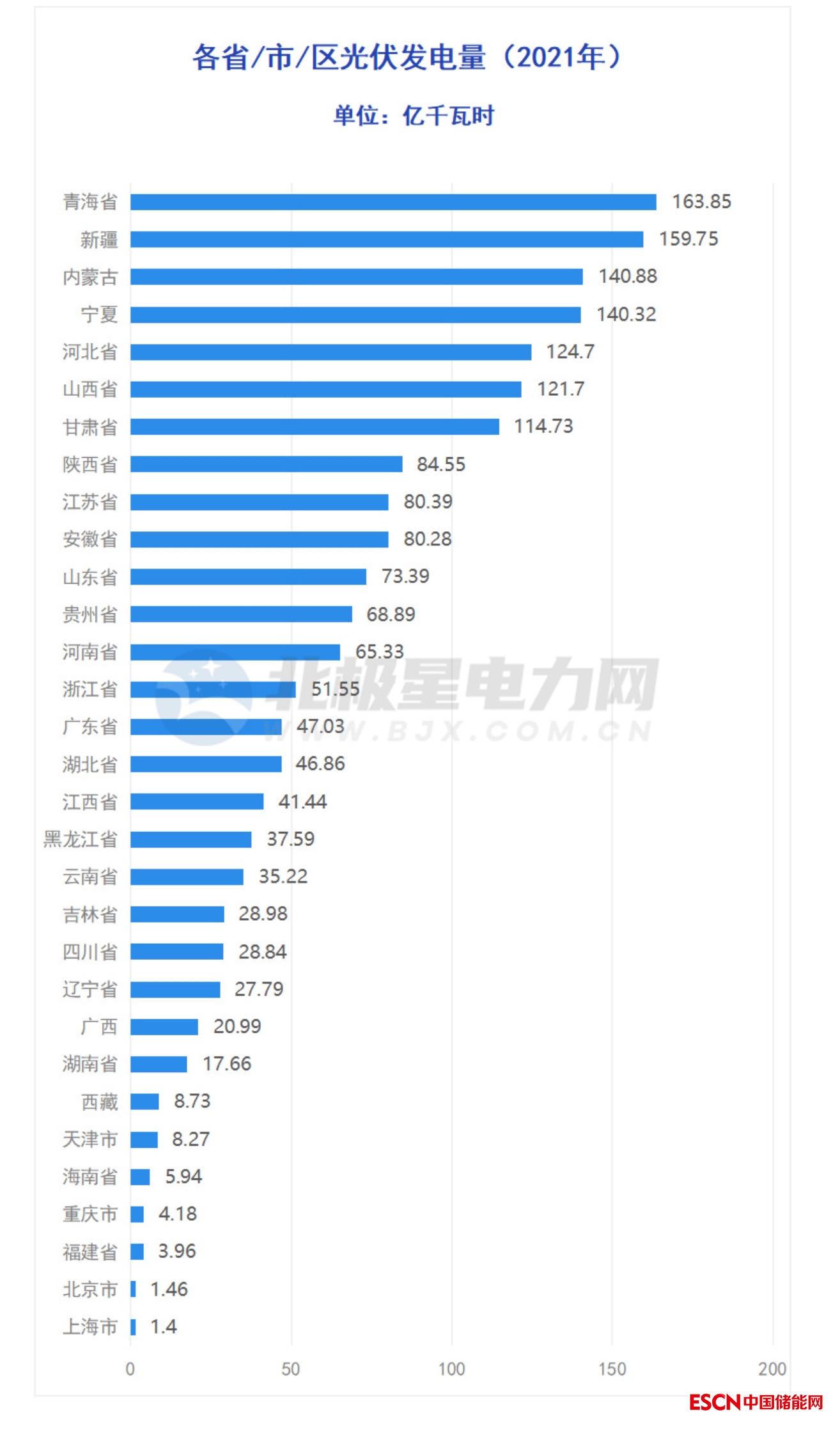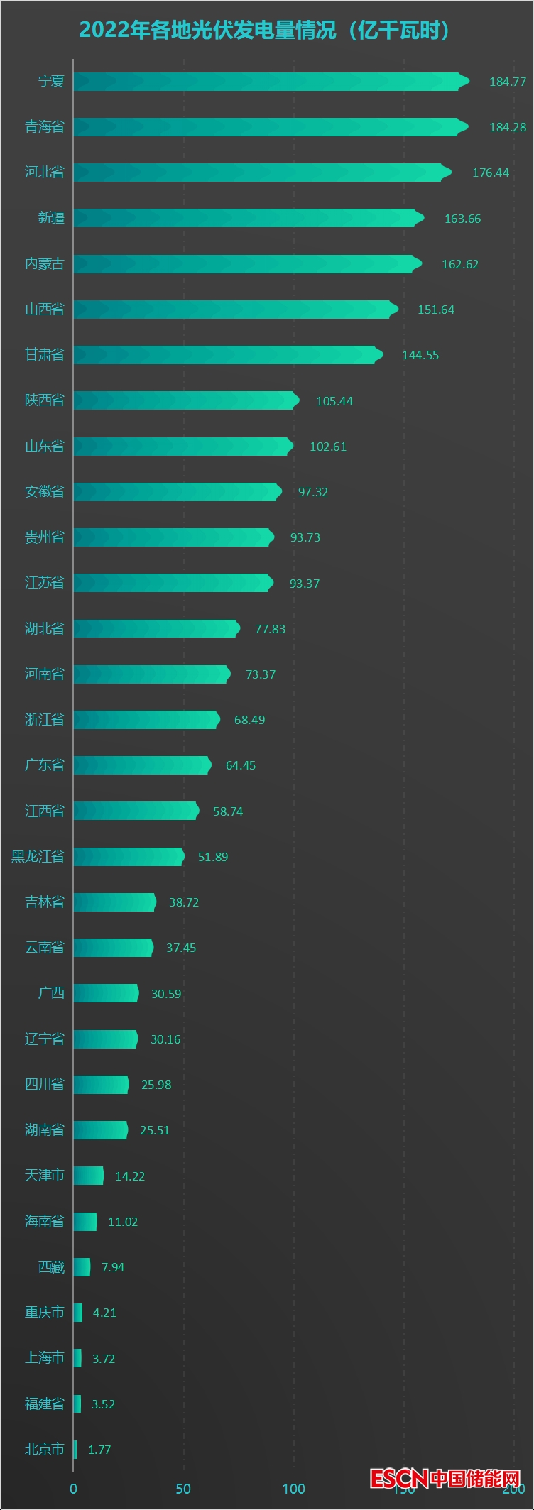 2022年,光伏發(fā)電量排名TOP5的地方分別是:寧夏(184.77億千瓦時)、青海?。?84.28億千瓦時)、河北?。?76.44億千瓦時)、新疆(163.66億千瓦時)、內蒙古(162.62億千瓦時)。