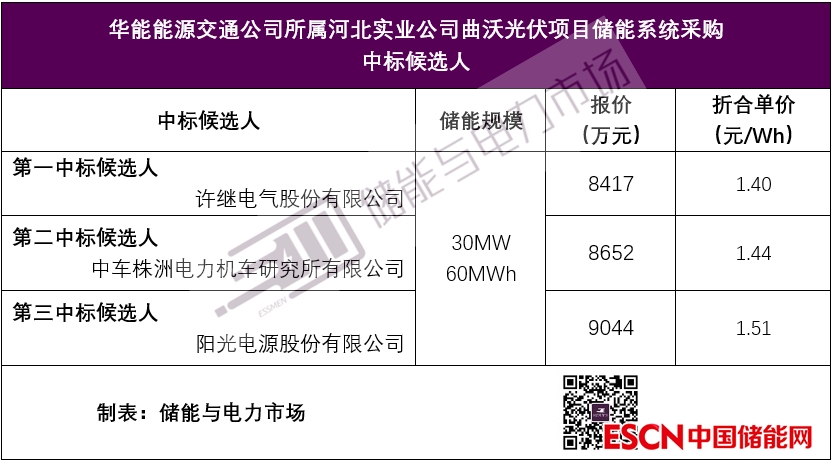 許繼電氣股份有限公司總報(bào)價(jià)8417萬(wàn)元,折合單價(jià)1.4元/Wh,成為第一中標(biāo)候選人。