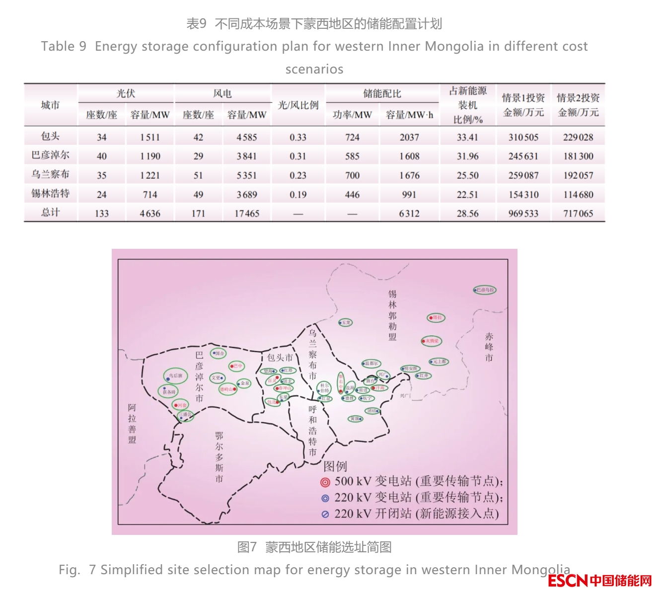 基于選型選址和案例分析結(jié)果,對蒙西地區(qū)進行整體優(yōu)化,提出蒙西地區(qū)儲能配置的規(guī)劃方案。該儲能配置方案的技術(shù)目標(biāo)為將風(fēng)光出力波動率降低30%,經(jīng)濟目標(biāo)為實現(xiàn)儲能的利潤最大化。為了反映儲能成本變化對于儲能整體投資的影響,基于不同儲能成本設(shè)置2個儲能成本場景。情景1:儲能單位容量成本為1.4元/MW·h,單位功率成本為0.35元/MW;情景2:儲能單位容量成本為1元/MW·h,單位功率成本為0.35元/MW。其他參數(shù)設(shè)置與案例參數(shù)設(shè)置保持一致。不同成本場景下蒙西地區(qū)的儲能配置計劃如表9所示,儲能配置的地址選擇如圖7所示。