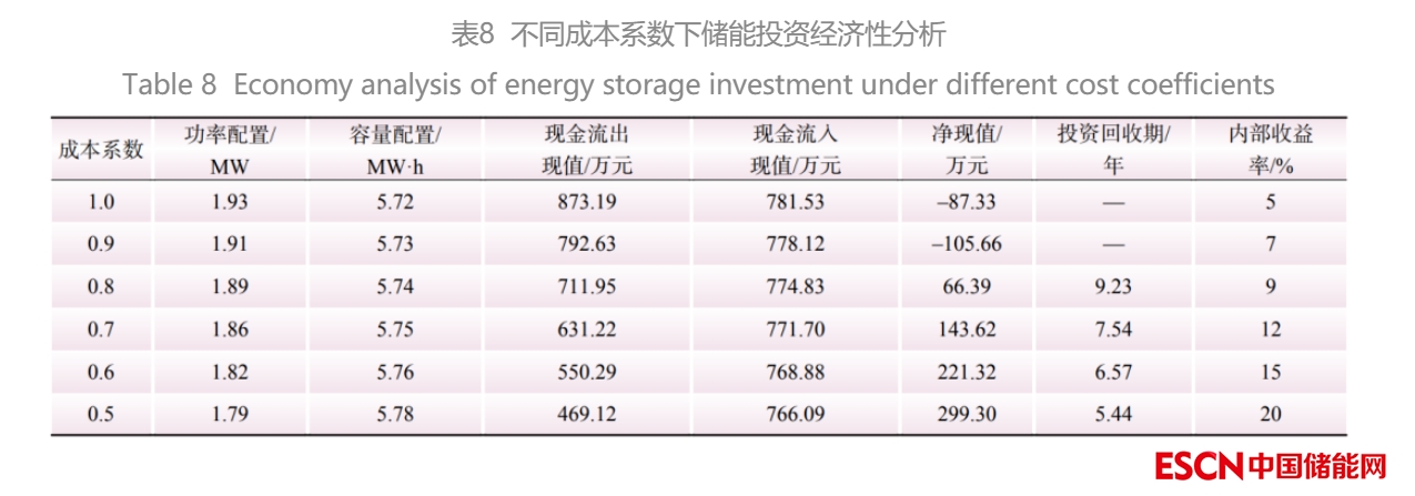 從表8可以看出,儲能的功率配置、容量配置和現(xiàn)金流入對于儲能的成本變化并不敏感,儲能成本的下降主要影響其初始投資成本,進而影響凈現(xiàn)值、投資回收期以及內(nèi)部收益率等投資經(jīng)濟性指標(biāo)。成本系數(shù)為1時,該項目的內(nèi)部收益率僅為5%,低于設(shè)定的8%的貼現(xiàn)率,不具有經(jīng)濟性,當(dāng)儲能成本下降20%時,該項目的內(nèi)部收益率則增長到9%,初步具有投資經(jīng)性,而當(dāng)儲能成本下降50%時,該項目的內(nèi)部收益率高達20%,具有良好的投資經(jīng)濟性。因此,儲能成本下降是提升儲能大規(guī)模配置積極性的重要影響因素。