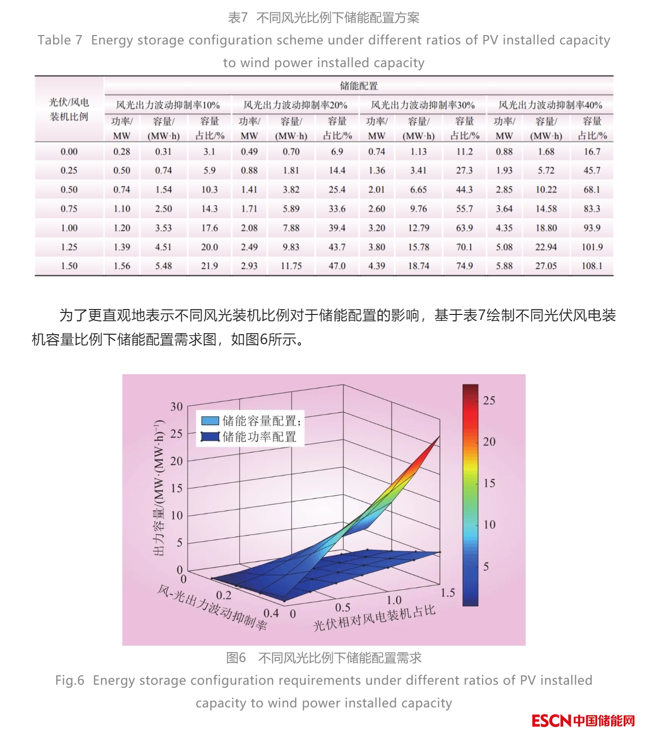 由表7和圖6可知,在風(fēng)光出力波動抑制率一定的情況下,隨著光伏相對風(fēng)電裝機占比的提升,儲能容量和功率配置需求均呈現(xiàn)上升趨勢,且容量配置需求增長趨勢顯著快于功率配置需求。當(dāng) σp= 10%,光/風(fēng)比例從0增長到1.5時,儲能的功率配置需求從0.28 MW增長到1.56 MW,漲幅為457.14%,而容量配置從0.31 MW·h增長到5.48 MW·h,漲幅高達1667.74%。在光/風(fēng)比例一定的情況下,隨著風(fēng)光出力波動抑制率的增加,儲能的容量配置需求增長趨勢同樣顯著快于功率配置需求。當(dāng)光/風(fēng)比例為0.75, σp 從10%增長到40%時,功率需求從1.1 MW增長到3.64 MW,漲幅為230.90%,而容量配置從2.5 MW·h增長到14.58 MW·h,漲幅高達483.2%,且儲能容量占可再生能源總裝機容量的比重高達83.3%。因此,較高的光/風(fēng)比例以及出力波動抑制率要求下,儲能的經(jīng)濟性配置具有極高難度。當(dāng)光/風(fēng)比例和出力波動抑制率分別控制在35%和30%以內(nèi)時,儲能的配置較為經(jīng)濟合理。
