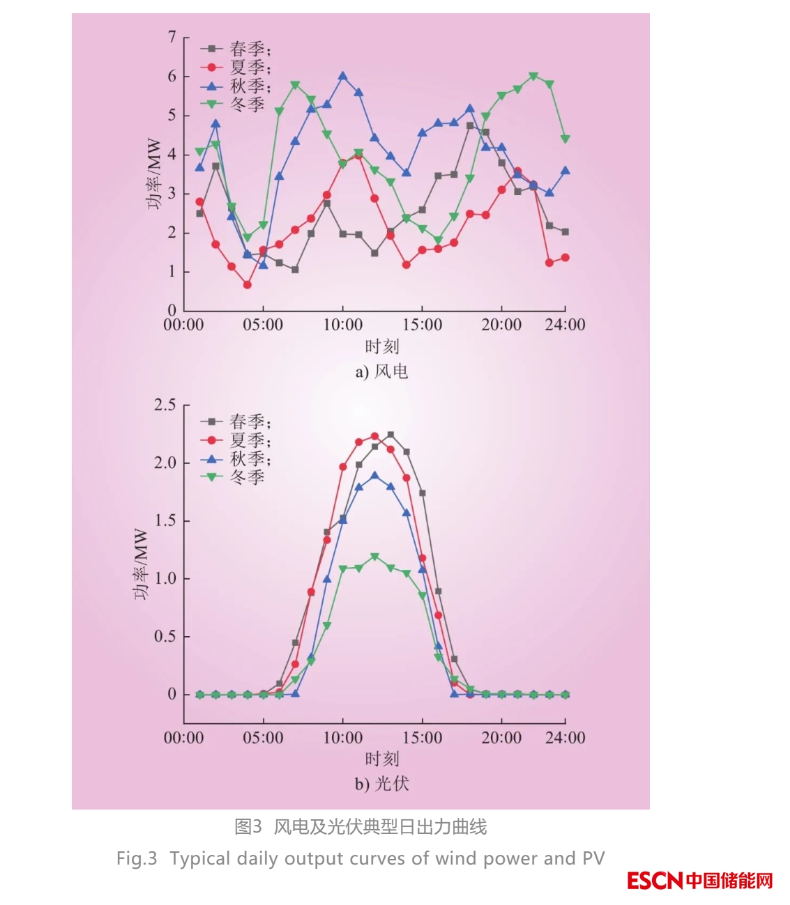 該地區(qū)的新能源由裝機容量為10 MW的風(fēng)電站和2.5 MW的光伏發(fā)電站構(gòu)成,能統(tǒng)一接入節(jié)點A。以季節(jié)變化為周期,該地區(qū)風(fēng)、光的典型日出力曲線如圖3所示。根據(jù)國家《國家發(fā)展改革委關(guān)于2021年新能源上網(wǎng)電價政策有關(guān)事項的通知》,蒙西地區(qū)風(fēng)電、光伏的上網(wǎng)電價為0.278 5元/(kW·h)。