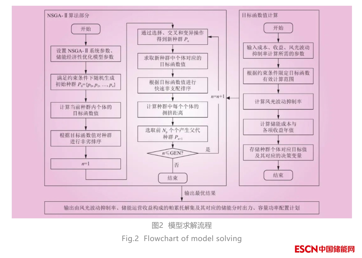 儲能技術(shù)經(jīng)濟性優(yōu)化模型為多目標(biāo)優(yōu)化問題,基于加權(quán)法和目標(biāo)規(guī)劃算法的傳統(tǒng)數(shù)學(xué)優(yōu)化方法帶有一定的主觀性,無法有效求得多目標(biāo)算法的帕累托最優(yōu)解集合。NSGA-Ⅱ是目前求解大規(guī)模多目標(biāo)優(yōu)化模型的有效算法,具有計算速度快、求解精度高、解集收斂性好、可求得帕累托最優(yōu)解集等特點[27]?;诖?,本文采用NSGA-Ⅱ算法對儲能技術(shù)經(jīng)濟性優(yōu)化模型進行求解,算法流程圖如圖2所示。