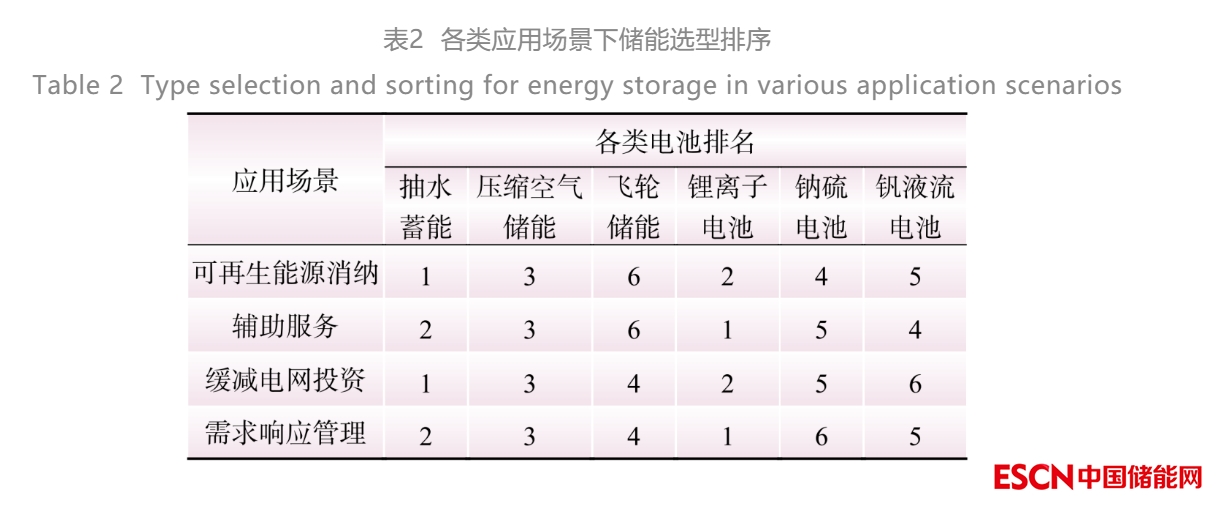 文獻[24]從技術(shù)、經(jīng)濟、效率、環(huán)境4個維度建立了適應(yīng)各種場景的儲能選型指標(biāo)體系,通過貝葉斯最優(yōu)最劣法確定了不同場景下的指標(biāo)權(quán)重,并通過模糊前景理論對儲能在各種場景下的選型進行了綜合評價,進而得出了儲能在各類應(yīng)用場景的排序,如表2所示。該選型排序研究并未涉及與地區(qū)相關(guān)的因素,具有一定的通用性,因此本文采用該選型排序結(jié)論確定蒙西地區(qū)儲能類型。