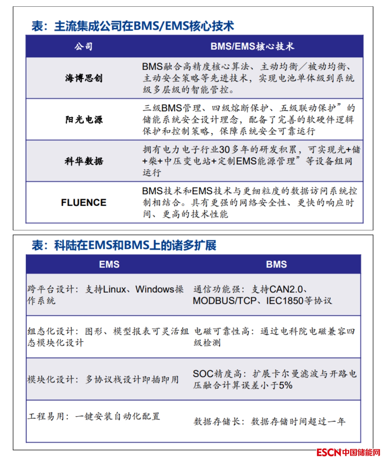 儲能系統(tǒng)搭建的經驗積累是重要因素,管理系統(tǒng)往往是自主搭建。下游應用場景涉及火電廠聯(lián)合調頻、新能源配套儲能、電網側調峰、 用戶側填谷套利、無電地區(qū)微電網等多個領域,儲能集成環(huán)節(jié)對電網理解和EMS/BMS相應能力要求較高。主流儲能廠商在電池和PCS方面或許可通過外采進行配套,但涉及監(jiān)控、管理等的BMS與EMS系統(tǒng)基本都是集成廠商自主設計。