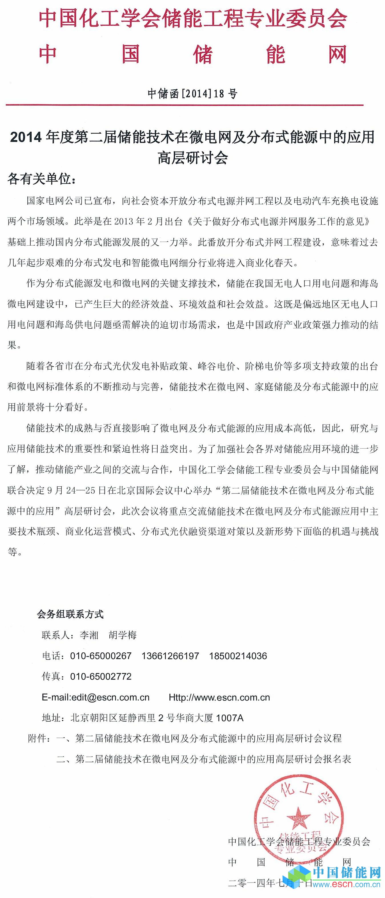 關(guān)于召開第二屆儲能技術(shù)在微電網(wǎng)及分布式能源中的應(yīng)用高層研討會(huì)的通知
