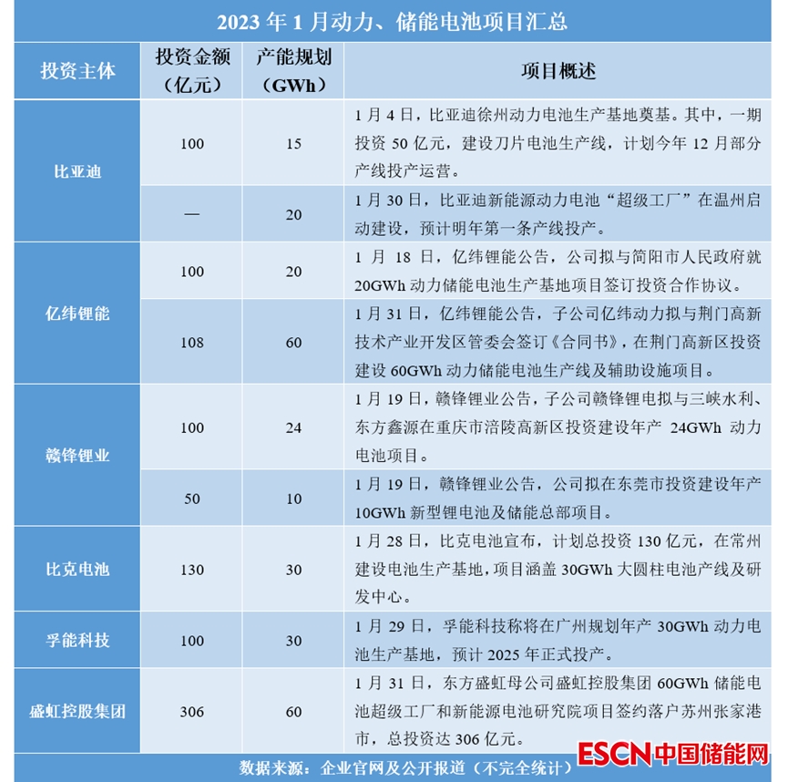 中國(guó)儲(chǔ)能網(wǎng)訊:2023年剛剛開始,動(dòng)力電池企業(yè)便再掀起了一輪擴(kuò)產(chǎn)潮。2023年1月,比亞迪、億緯鋰能、贛鋒鋰業(yè)、比克電池等動(dòng)力電池企業(yè)紛紛宣布擴(kuò)產(chǎn),且投資規(guī)模幾乎都在百億以上。