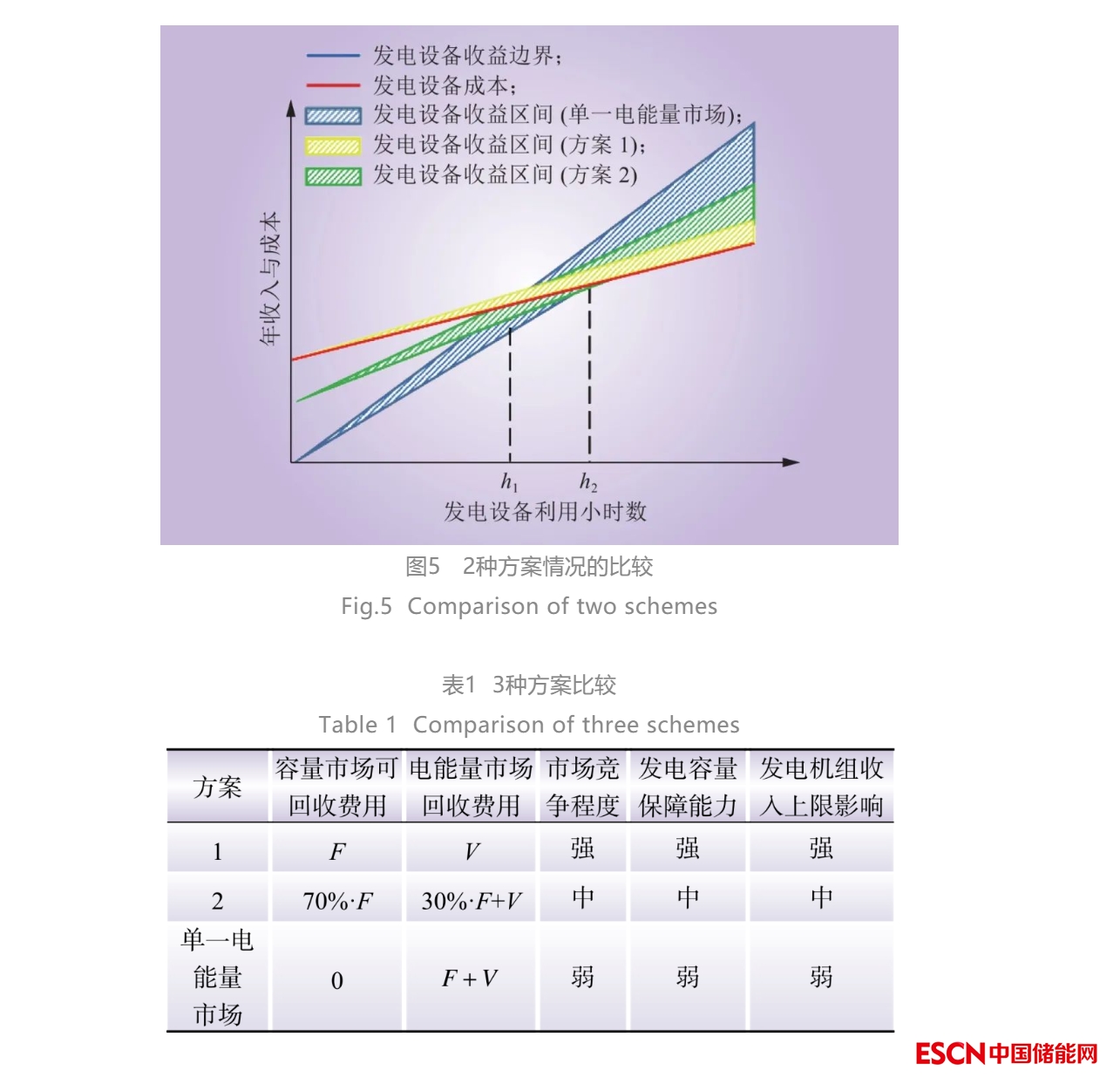 2種方案情況的收益情況比較如圖5所示。本文所提方案與單一電能量市場(chǎng)的情況比較如表1所示。表1中: F 為發(fā)電設(shè)備的固定成本; V 為發(fā)電企業(yè)的變動(dòng)成本。結(jié)合圖5和表1可以看出:(1)方案2的發(fā)電設(shè)備有固定成本回收壓力。該方案下單位發(fā)電量的期望收益上升時(shí),收益區(qū)間將增大。在發(fā)電設(shè)備利用小時(shí)數(shù)大于一定值時(shí),方案2的發(fā)電設(shè)備收益高于方案1的發(fā)電設(shè)備收益,從而導(dǎo)致用戶用能價(jià)格稍高。(2)方案1可以減少固定成本回收壓力,從而促進(jìn)發(fā)電商按照邊際成本報(bào)價(jià),加劇市場(chǎng)競(jìng)爭(zhēng),有利于釋放電力市場(chǎng)建設(shè)進(jìn)程中的改革紅利,降低用戶用能成本。方案2可以促進(jìn)發(fā)電商發(fā)電積極性,以更高的發(fā)電量獲得更好收益。(3)方案1包含了發(fā)電設(shè)備的全部固定成本,可以有力保證所需發(fā)電容量的經(jīng)營(yíng)情況,故其對(duì)全系統(tǒng)發(fā)電容量有強(qiáng)力的保障。發(fā)電設(shè)備需在電能量市場(chǎng)競(jìng)爭(zhēng)從而回收30%的固定成本,方案2對(duì)發(fā)電容量保障能力相對(duì)弱于方案1。