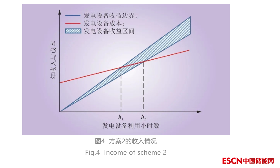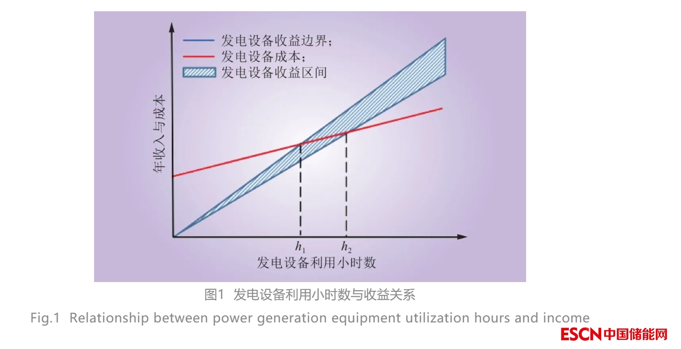 從圖1中可以看出,發(fā)電設(shè)備由于能效不同,單位利用小時(shí)數(shù)的收益也不同。發(fā)電設(shè)備的收益可以表示為一個(gè)區(qū)間。當(dāng)發(fā)電利用小時(shí)數(shù)低于h1時(shí),發(fā)電設(shè)備虧損。當(dāng)利用小時(shí)數(shù)高于h2時(shí),發(fā)電設(shè)備盈利。