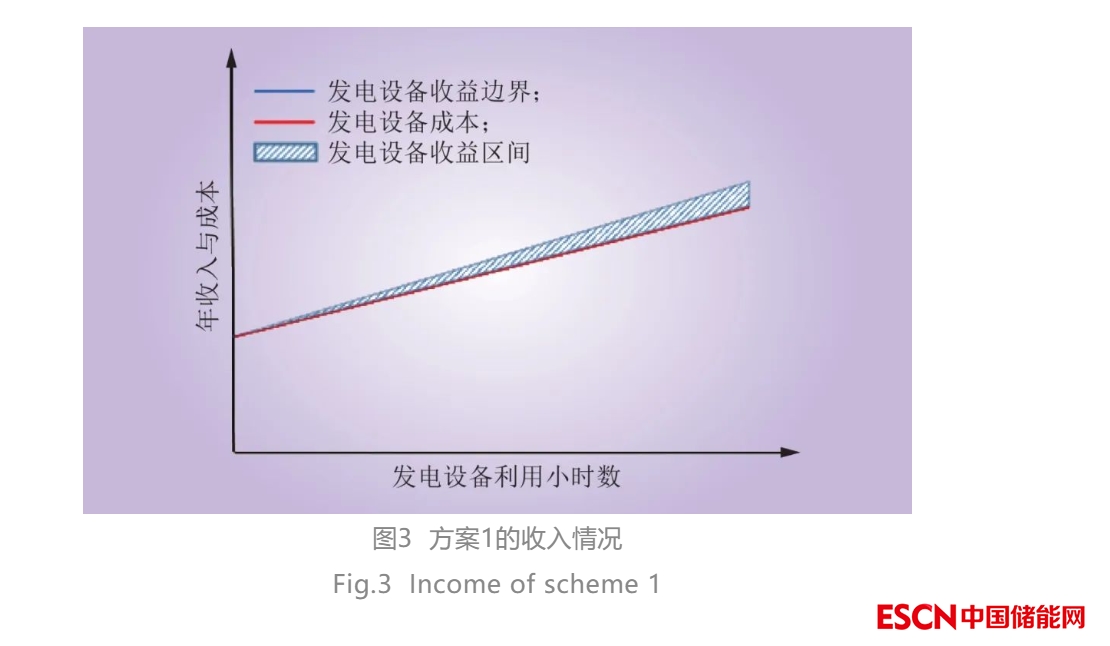 方案1為容量市場(chǎng)覆蓋發(fā)電設(shè)備固定成本的100%,電能量市場(chǎng)覆蓋發(fā)電設(shè)備變動(dòng)成本及準(zhǔn)許收益。發(fā)電設(shè)備利用小時(shí)數(shù)及收益情況如圖3所示。從圖3中可以看出,容量市場(chǎng)覆蓋全部固定成本的情況下,發(fā)電商會(huì)通過(guò)電能量市場(chǎng)競(jìng)爭(zhēng)獲得發(fā)電設(shè)備上網(wǎng)發(fā)電量,從而獲取相應(yīng)利潤(rùn)。發(fā)電設(shè)備固定成本已由容量市場(chǎng)覆蓋。發(fā)電商回收固定成本壓力小,只要上網(wǎng)發(fā)電就可以獲利。發(fā)電商可以在電能量市場(chǎng)報(bào)價(jià)中增加合理收益來(lái)獲得發(fā)電資格,從而不用顧慮固定成本帶來(lái)的成本回收問(wèn)題。相較于單一電能量市場(chǎng)的價(jià)格收益,“容量市場(chǎng)+電能量市場(chǎng)”結(jié)合的市場(chǎng)機(jī)制可以促進(jìn)發(fā)電商競(jìng)爭(zhēng),降低發(fā)電商的固定成本回收壓力,促進(jìn)發(fā)電廠提高經(jīng)濟(jì)效率。