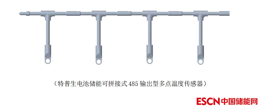 儲能房的環(huán)境熱的檢測,體現(xiàn)于機(jī)組房內(nèi)部的各點(diǎn)溫度檢測。由于空間大,點(diǎn)數(shù)多,布線復(fù)雜,傳統(tǒng)方式布局人工大、用線數(shù)量多,維護(hù)困難,無法定點(diǎn)排除故障等缺點(diǎn)。特普生為此設(shè)計(jì)了一種可拼接式485輸出的多點(diǎn)溫度傳感器,如下圖所示。