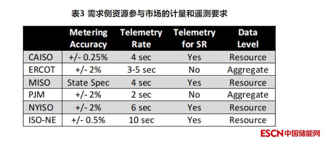 由于需求側(cè)資源比傳統(tǒng)的發(fā)電機要小得多,使同規(guī)模的需求側(cè)資源在參與輔助服務市場時達到與傳統(tǒng)資源一樣的計量和遙測標準,可能會花費更多成本。表3顯示各個市場中的有關要求。