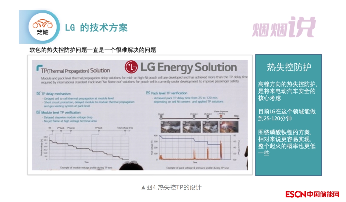 軟包的熱失控防護(hù)問題一直是一個很難解決的問題,高鎳方向的熱失控防護(hù),是將來電動汽車安全的核心考慮。目前LG在這個領(lǐng)域能做到25-120分鐘,圍繞磷酸鐵鋰的方案,相對來說更容易實(shí)現(xiàn),整個起火的概率也更低一些。
