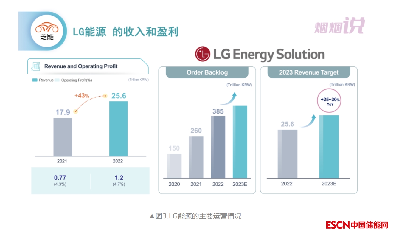 2022年全年營業(yè)收入25.6萬億韓元(人民幣1334.58億元),同比增長43%,是LGES的歷史最高銷售額,積極響應(yīng)電動汽車、儲能等市場需求,產(chǎn)品線的電池出貨量均實(shí)現(xiàn)增長。營業(yè)利潤同比增長58%,1.2萬億韓元(折合人民幣62.56億元),全年凈利潤為8,000億韓元(折合人民幣41.71億元),凈利潤率3%。