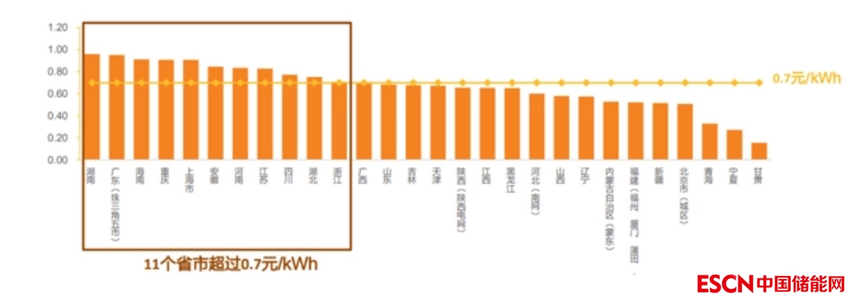 使用儲能劃不劃算,要看——LCOE(度電成本),這個判斷工商業(yè)儲能經(jīng)濟性的指標。當峰谷差價> 儲能LCOE時,企業(yè)安裝儲能設(shè)備自然就可以節(jié)省用電成本。理想狀態(tài)下測算,每天一充一放下儲能LCOE≈0.63元/kwh,最新的數(shù)據(jù)顯示,已有11省的峰谷價差超過0.7元/kWh。