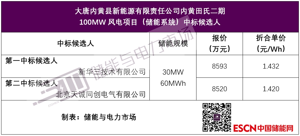 新華三技術有限公司以總報價8593萬元,折合單價1.432元/Wh,成為第一中標候選人。