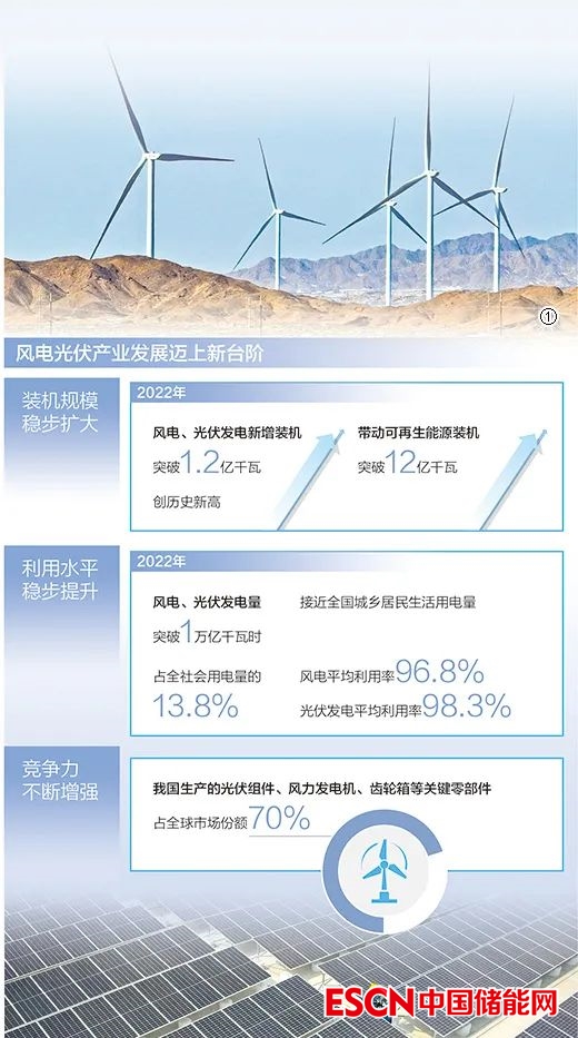 中國(guó)儲(chǔ)能網(wǎng)訊:出口總額超過(guò)512億美元,同比增長(zhǎng)80.3%——2022年,我國(guó)光伏產(chǎn)業(yè)在國(guó)際市場(chǎng)的表現(xiàn)亮眼。歷經(jīng)多年深耕細(xì)作,我國(guó)風(fēng)電光伏產(chǎn)業(yè)競(jìng)爭(zhēng)力大幅提升,光伏組件、風(fēng)力發(fā)電機(jī)、齒輪箱等關(guān)鍵零部件占全球市場(chǎng)份額的比重提升至70%。在國(guó)內(nèi),風(fēng)電光伏也已成為新增發(fā)電裝機(jī)和新增發(fā)電量的主體,2022年占比分別達(dá)到78%和55%以上,累計(jì)裝機(jī)突破7億千瓦,相當(dāng)于30多個(gè)三峽電站。