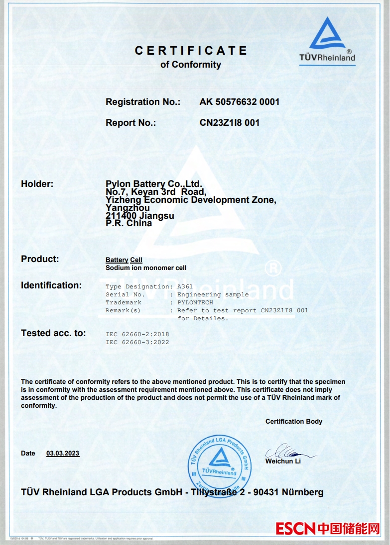 中國儲(chǔ)能網(wǎng)訊:3月3日,上海派能能源科技股份有限公司(以下簡稱派能科技)收到德國萊茵TüV集團(tuán)(以下簡稱TüV萊茵)頒發(fā)的關(guān)于鈉離子電池認(rèn)證證書,該證書為TüV萊茵頒發(fā)的全球首張鈉離子電池認(rèn)證證書。