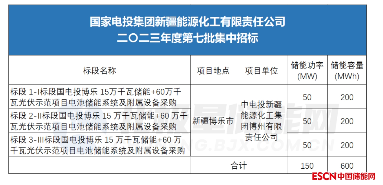 公告顯示,本批次集中招標(biāo)用于新疆博樂(lè)市西南側(cè)國(guó)電投博樂(lè)光伏示范項(xiàng)目35千伏開(kāi)關(guān)站儲(chǔ)能區(qū),共包含3個(gè)標(biāo)段,儲(chǔ)能總規(guī)模150MW/600MWh。