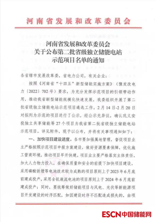 中國儲(chǔ)能網(wǎng)訊:3月2日,河南省發(fā)改委下發(fā)《關(guān)于公布第二批省級(jí)獨(dú)立儲(chǔ)能電站示范項(xiàng)目名單的通知》?!锻ㄖ繁硎?,經(jīng)公示無異議,確認(rèn)鞏義安投獨(dú)立共享儲(chǔ)能等27個(gè)項(xiàng)目,為河南省第二批省級(jí)獨(dú)立儲(chǔ)能電站示范項(xiàng)目。規(guī)模共2.5GW/5.2GWh。