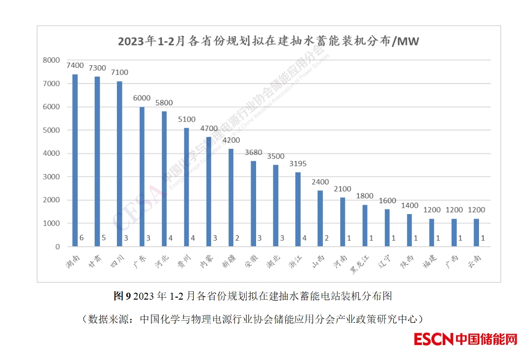 2023年1-2月共有49個抽水蓄能電站項目簽約、通過審核或有新進(jìn)展,總規(guī)劃規(guī)模達(dá)7.0875GW,由圖9可知,抽水蓄能電站規(guī)劃規(guī)模在5GW以上的省份有6個,其中湖南省新規(guī)劃的抽水蓄能電站最多,有6個,規(guī)模也最大,達(dá)7400MW;甘肅省5個規(guī)劃中的抽水蓄能電站規(guī)劃規(guī)模僅次于湖南省,達(dá)7300MW;四川省抽水蓄能規(guī)劃規(guī)模也突破了7000MW,三個抽水蓄能電站規(guī)劃規(guī)模高達(dá)7100MW;廣東省和河北省規(guī)劃規(guī)模在6000MW左右;貴州4個抽水蓄能電站規(guī)模達(dá)5100MW。
