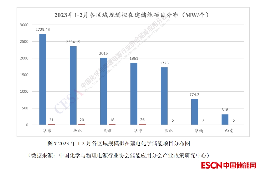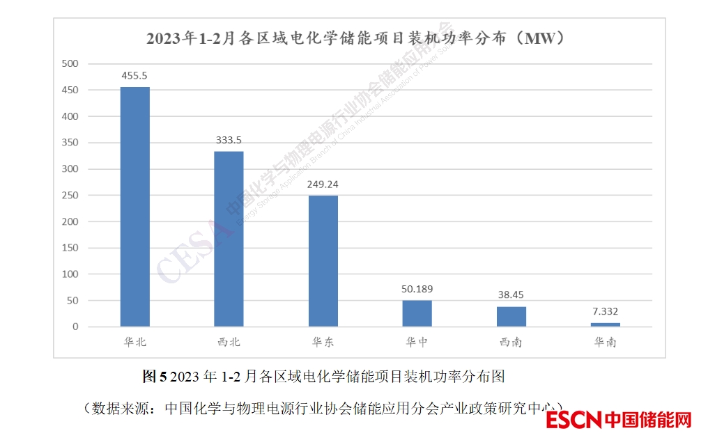 由圖5可知,2023年電化學(xué)儲能投運項目裝機(jī)主要集中在華北、西北和華東區(qū)域,這一方面在于內(nèi)蒙、西藏等地集中式新能源儲能項目的投運,另一方面也在于安徽、寧夏等地共享儲能、電網(wǎng)側(cè)儲能項目的投運。