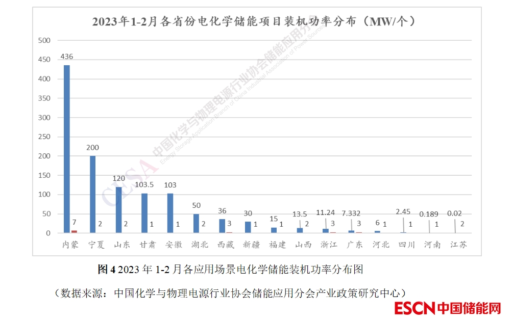 2023年1-2月投運的電化學(xué)儲能項目以集中式新能源儲能項目和用戶側(cè)儲能項目為主,分別有14個和9個項目投運,由圖2和圖3可知,集中式新能源投運項目主要集中在內(nèi)蒙古等華北、西北區(qū)域,用戶側(cè)儲能則集中在江蘇、浙江等華東區(qū)域,但從規(guī)模來看,用戶側(cè)儲能項目裝機(jī)功率僅為16.211MW,集中式新能源儲能項目獨占鰲頭,投運裝機(jī)功率達(dá)783MW,而共享儲能緊隨其后,寧夏吳忠市紅寺堡區(qū)旭寧能源科技有限公司100兆瓦/200兆瓦時儲能項目、湖北金開新能源石首共享儲能電站和淮北皖能儲能電站一期工程3個項目投運裝機(jī)規(guī)模達(dá)253MW;電網(wǎng)側(cè)儲能項目投運5個,裝機(jī)功率為42MW;分布式及微網(wǎng)儲能項目以及電源側(cè)輔助服務(wù)項目各一個,裝機(jī)功率分別為25MW和15MW。