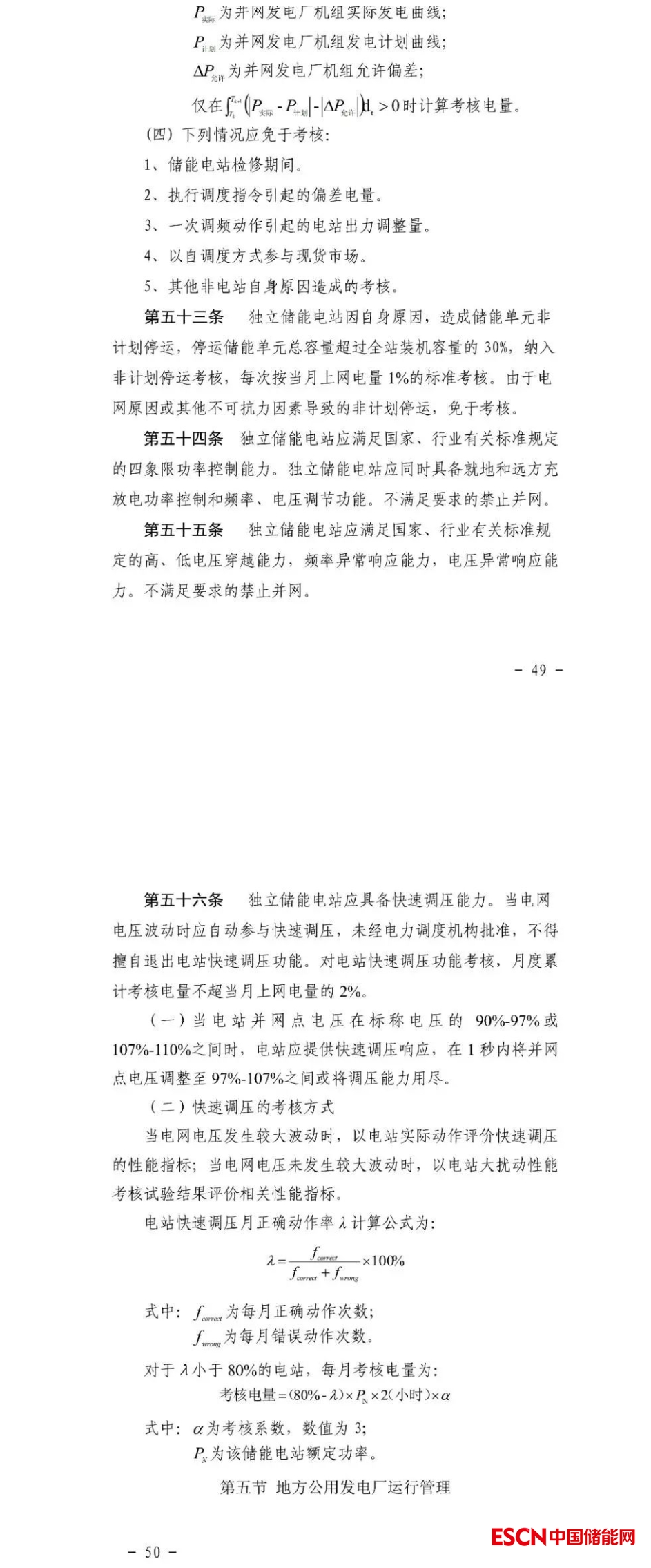 獨(dú)立儲(chǔ)能電站應(yīng)具備一次調(diào)頻功能,并保持一次調(diào)頻功能投入,一次調(diào)頻投/退信號(hào)應(yīng)接入電力調(diào)度機(jī)構(gòu)。獨(dú)立儲(chǔ)能電站一次調(diào)頻的死區(qū)、調(diào)節(jié)容量、調(diào)節(jié)速率、調(diào)節(jié)精度、響應(yīng)時(shí)間等性能指標(biāo)應(yīng)滿(mǎn)足國(guó)家標(biāo)準(zhǔn)要求。當(dāng)電網(wǎng)頻率波動(dòng)時(shí)應(yīng)自動(dòng)參與一次調(diào)頻,未經(jīng)電力調(diào)度機(jī)構(gòu)批準(zhǔn),不得擅自退出一次調(diào)頻功能。對(duì)獨(dú)立儲(chǔ)能電站一次調(diào)頻的可用率和性能進(jìn)行考核,月度累計(jì)考核電量不超當(dāng)月上網(wǎng)電量1%。