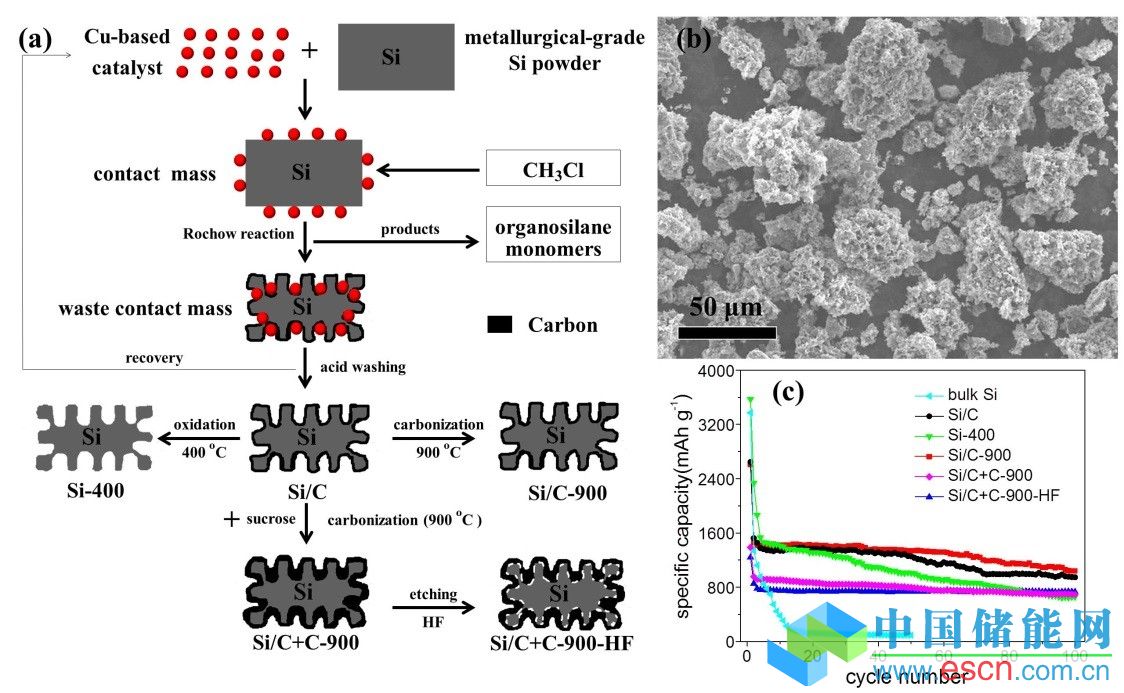 此外,他們利用有機(jī)硅主要單體二甲基二氯硅烷作為硅源和碳源,通過化學(xué)氣相沉積的方法,對(duì)商業(yè)化石墨負(fù)極材料進(jìn)行表面改性,得到了性能優(yōu)良的硅/碳復(fù)合負(fù)極材料(Journal of Materials Chemistry A 2013, 1, 4483-4489);利用單體合成中的廉價(jià)液相副產(chǎn)物一甲基三氯硅烷作為硅源和碳源,通過化學(xué)氣相沉積的方法,直接得到了高容量的硅/碳納米球形復(fù)合負(fù)極材料(Nanoscale 2013, 5, 5384-5389,Nanoscale 2014, 6, 371-377);利用有機(jī)硅工業(yè)生產(chǎn)中的含硅固體殘?jiān)?,?jīng)過提銅純化后,與商業(yè)石墨負(fù)極材料復(fù)合,制備了性能優(yōu)良的硅/碳復(fù)合負(fù)極材料(Journal of Power Sources 2013, 228, 112-119)。該課題組同時(shí)在有機(jī)硅單體合成使用的銅基催化劑的制備與廢銅催化劑的回收利用等方面也做了大量工作,發(fā)表了多篇文章,并申請(qǐng)了系列國家發(fā)明專利,詳見課題組網(wǎng)頁(http://cpme.mpcs.cn/)。最近,他們又以廉價(jià)軟碳材料(炭黑、石油焦、針狀焦等)和硅粉(商業(yè)納米硅粉、廢觸體提取的硅粉)等為原料,通過噴霧成球并高溫處理,得到多種微球復(fù)合負(fù)極材料,并申請(qǐng)了國家發(fā)明專利(201310053208.5、201310108230.5、201310214417.3),部分研究結(jié)果將陸續(xù)發(fā)表。