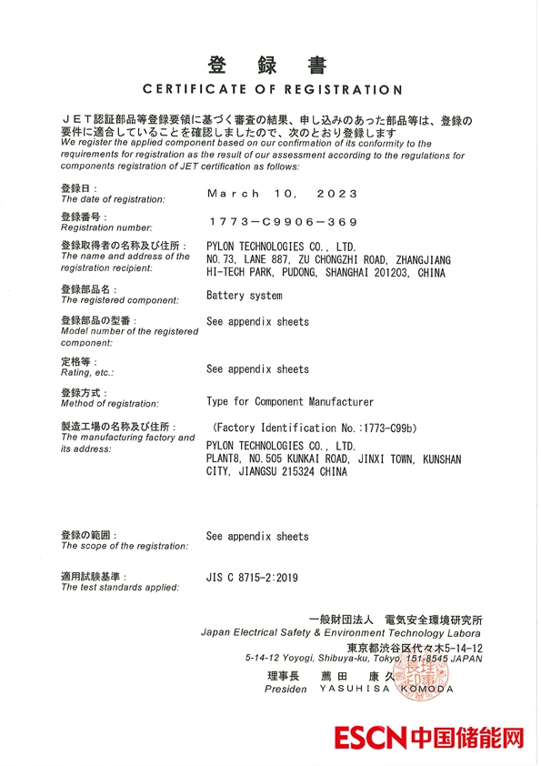 中國儲(chǔ)能網(wǎng)訊:2023 年3月10日,上海派能能源科技股份有限公司 (以下簡(jiǎn)稱派能科技)獲日本JET頒布的鋰電系統(tǒng)認(rèn)證證書。