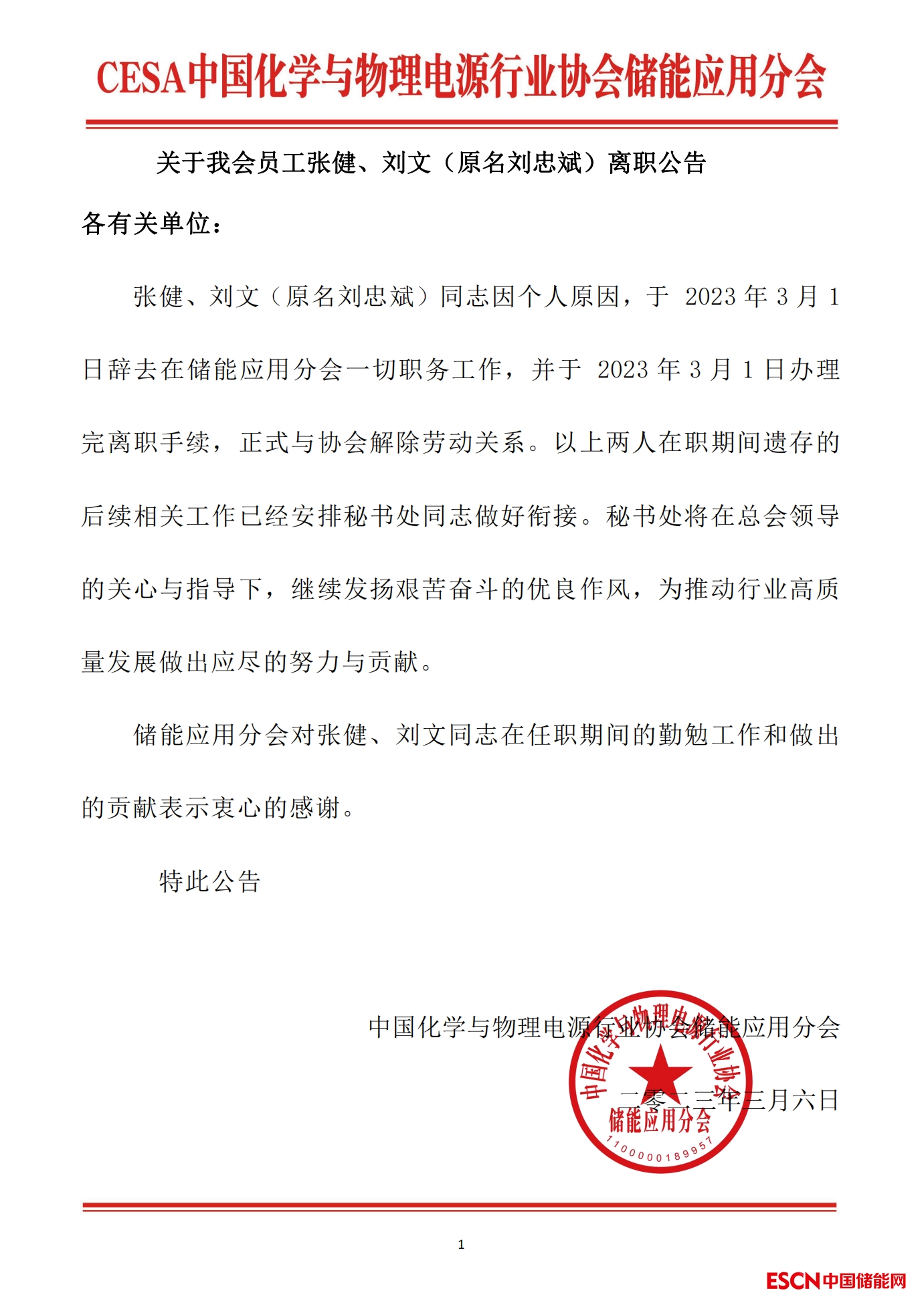 張健、劉文(原名劉忠斌)同志因個(gè)人原因,于 2023年3月1日辭去在儲能應(yīng)用分會(huì)一切職務(wù)工作,并于 2023年3月1日辦理完離職手續(xù),正式與協(xié)會(huì)解除勞動(dòng)關(guān)系。以上兩人在職期間遺存的后續(xù)相關(guān)工作已經(jīng)安排秘書處同志做好銜接。秘書處將在總會(huì)領(lǐng)導(dǎo)的關(guān)心與指導(dǎo)下,繼續(xù)發(fā)揚(yáng)艱苦奮斗的優(yōu)良作風(fēng),為推動(dòng)行業(yè)高質(zhì)量發(fā)展做出應(yīng)盡的努力與貢獻(xiàn)。