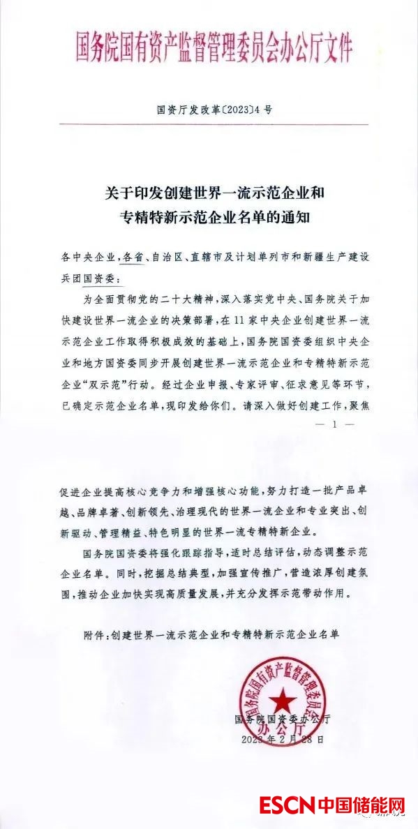 中國儲能網(wǎng)訊:近日,國務(wù)院國資委辦公廳發(fā)布了《關(guān)于印發(fā)創(chuàng)世界一流示范企業(yè)和專精特新示范企業(yè)名單的通知》,新風(fēng)光電子科技股份有限公司成功入選,成為全國首批200家創(chuàng)建世界一流專精特新企業(yè)之一,也是山東省三家入選企業(yè)之一。