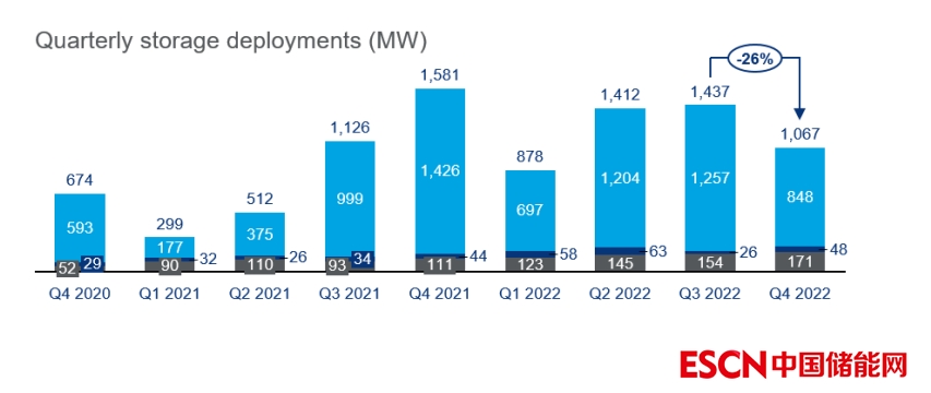 2022提第四季度部署的電池儲能系統(tǒng)裝機容量與2022年第三季度相比下降了26%,與2021年第四季度的1581MW相比減少了514MW。