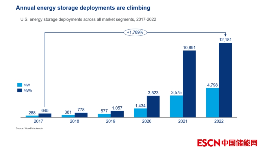 不過,美國所有細分儲能市場的部署量都在攀升,從2021年的3575MW/10891MWh增長到2022年的4798MW/12181MWh。