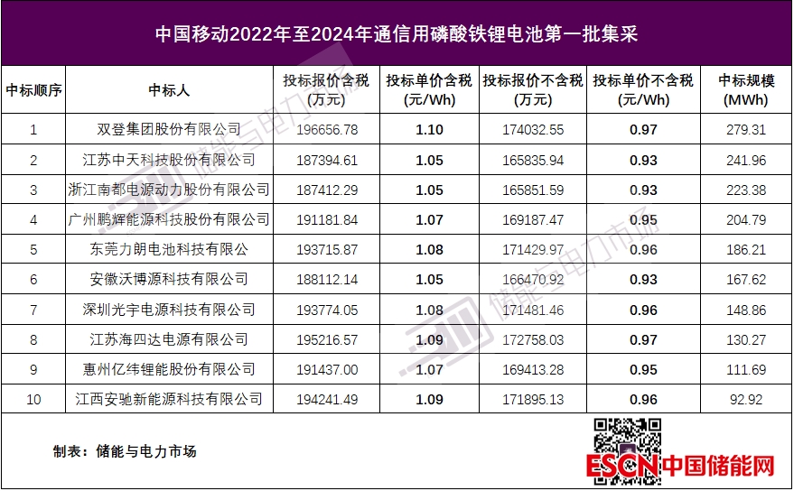 中國(guó)儲(chǔ)能網(wǎng)訊:近日,中國(guó)移動(dòng)2022年至2024年通信用磷酸鐵鋰電池產(chǎn)品集中采購(gòu)(第一批次)中標(biāo)候選人公示。采購(gòu)規(guī)模1.787GWh(單體電池3.2V磷酸鐵鋰電池,采購(gòu)需求數(shù)量為5.5858億Ah)。