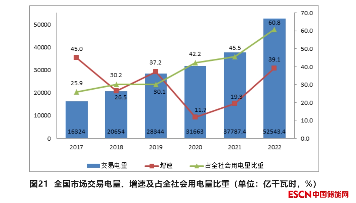 按交易結(jié)算口徑統(tǒng)計,2022年全國市場交易電量共5.25萬億千瓦時,同比增長39%,占全社會用電量比重達(dá)60.8%,同比提高15.4個百分點。其中,跨省跨區(qū)市場化交易電量首次超1萬億千瓦時,同比增長近50%。2022年國家電網(wǎng)經(jīng)營區(qū)域市場交易電量達(dá)4.16萬億千瓦時,同比增長42.7%;南方電網(wǎng)經(jīng)營區(qū)域市場交易電量0.85萬億千瓦時,同比增長27.4%;內(nèi)蒙古電網(wǎng)經(jīng)營區(qū)域市場交易電量0.24萬億千瓦時,同比增長24.9%。在電力交易機(jī)構(gòu)注冊的市場主體數(shù)量首次超過60萬家,同比增長29%。