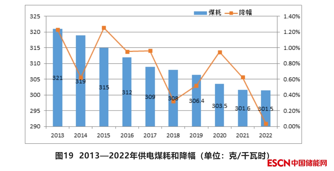 據(jù)中電聯(lián)快報數(shù)據(jù),2022年全國6000千瓦及以上電廠供電標(biāo)準(zhǔn)煤耗301.5克/千瓦時,同比降低0.1克/千瓦時,較2013年下降了19.5克/千瓦時。