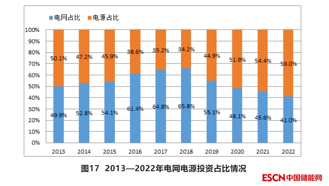 2022年全國電源基本建設(shè)投資占電力投資的比重為59%,較上年增加5.6個百分點;電網(wǎng)基本建設(shè)投資占電力投資的比重為41%。