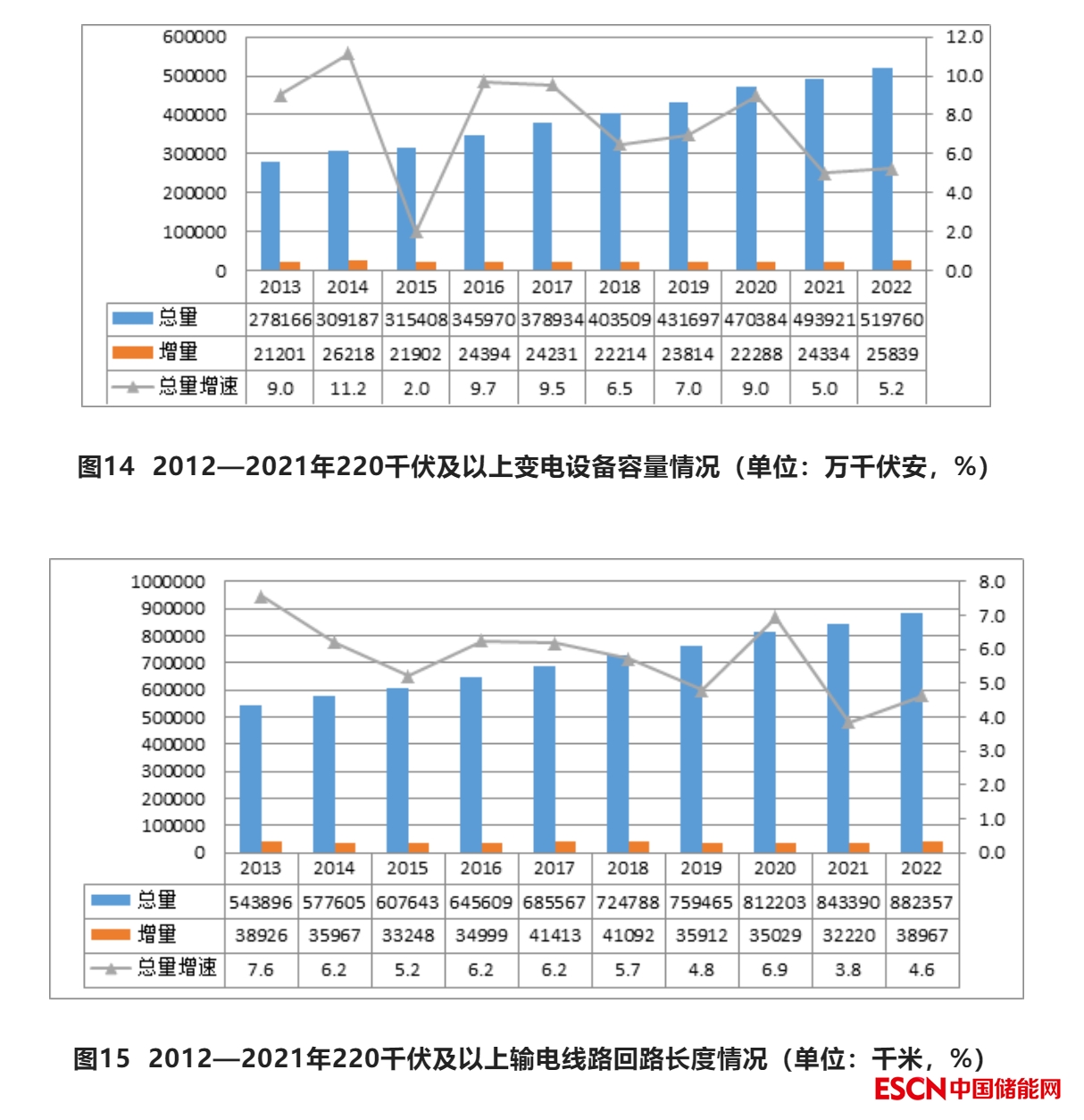 2022年,全國電網(wǎng)220千伏及以上變電設(shè)備容量共51.98億千伏安,同比增長5.2%;220千伏及以上輸電線路回路長度共88.2萬千米,同比增長4.6%。