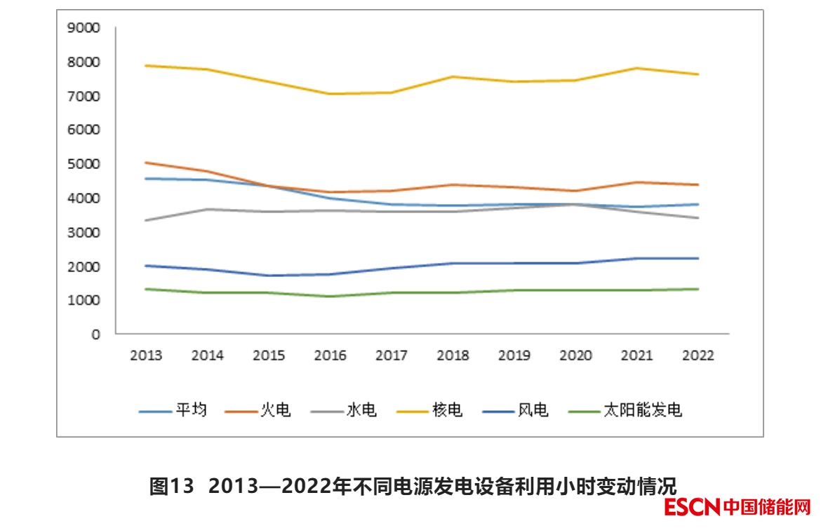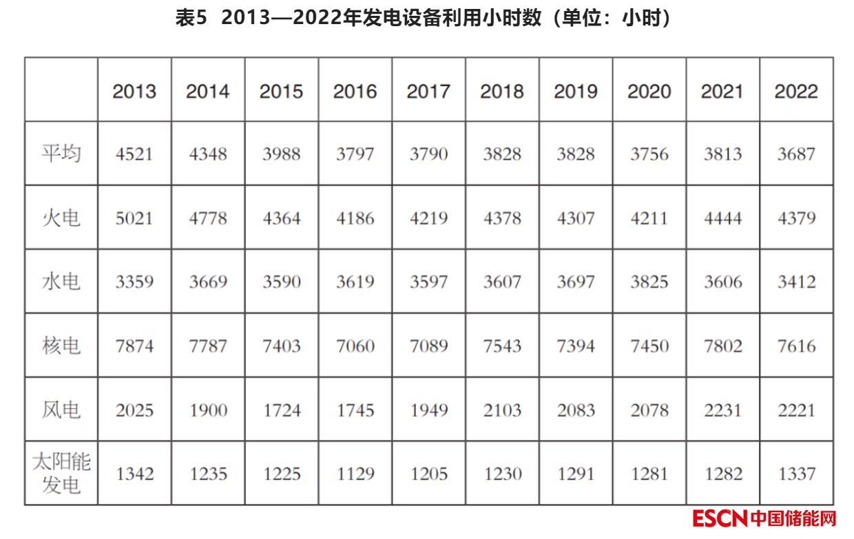 從近十年全國發(fā)電設(shè)備平均利用小時來看,總體呈下降趨勢,2015年下降至4000小時內(nèi)后平穩(wěn)在3800小時附近。2022年全國發(fā)電設(shè)備利用小時數(shù)同比降低126小時。受來水偏枯影響,水電利用小時數(shù)同比減少194小時,為2014年以來年度最低;核電同比降低186小時;并網(wǎng)風(fēng)電同比降低9小時;并網(wǎng)太陽能發(fā)電同比提高56小時;火電利用小時數(shù)近五年保持在4300小時上下。