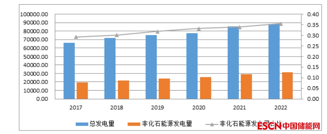 圖12 2017—2022年全國發(fā)電量及非化石能源發(fā)電占比情況(單位:億千瓦時,%)