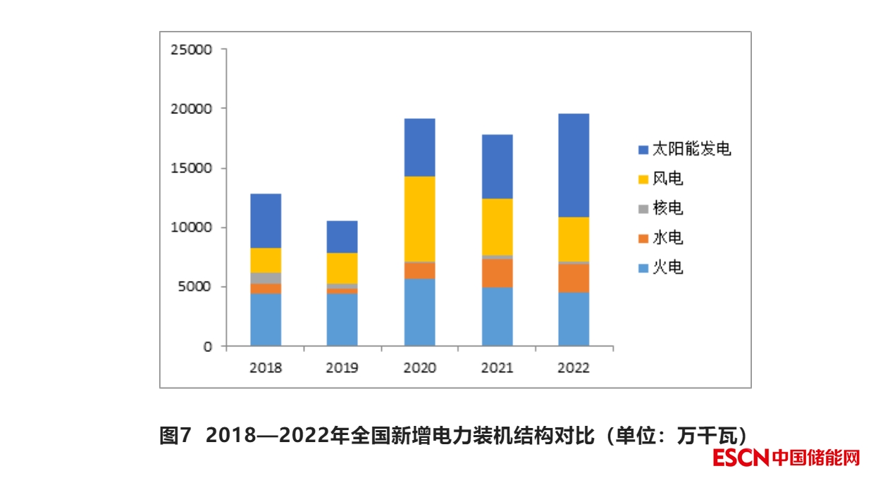 2018、2019兩年新增裝機(jī)規(guī)模連續(xù)下滑。2020年,在水電、風(fēng)電、太陽能發(fā)電裝機(jī)高速增長的帶動下,新增裝機(jī)容量大幅提升。2021年受火電、風(fēng)電新增裝機(jī)容量減少的影響,整體新增規(guī)模同比出現(xiàn)下滑。2022年,在火電、核電、風(fēng)電新增裝機(jī)增速負(fù)增長情況下,太陽能發(fā)電新增裝機(jī)容量增速達(dá)約60%,拉高全年新增裝機(jī)增速。