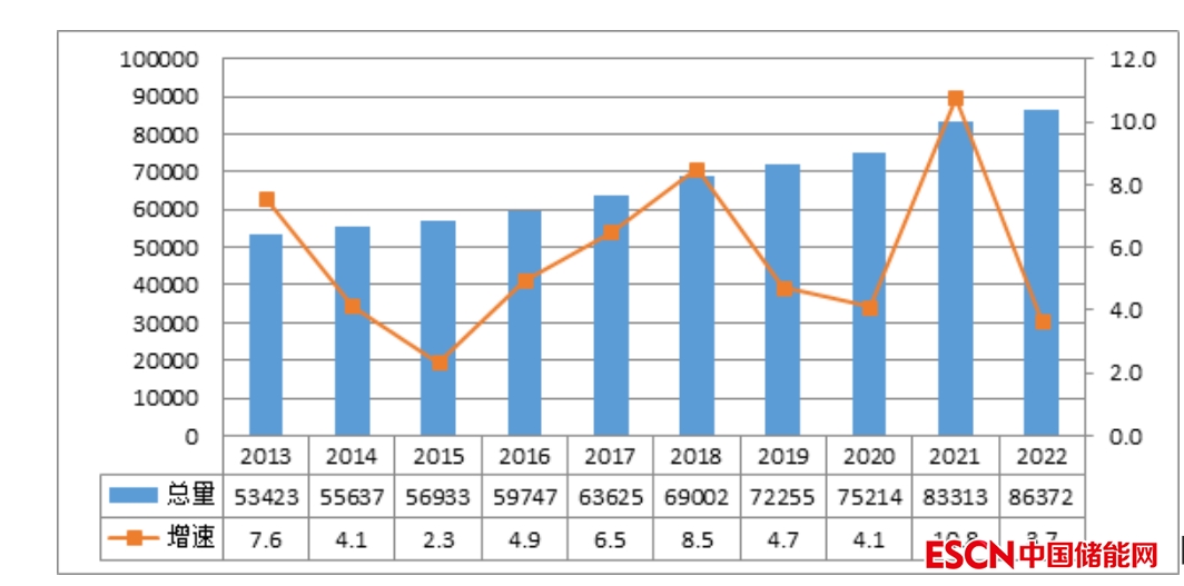 圖1 2013—2022年全國全社會用電量及增速情況(單位:億千瓦時,%)