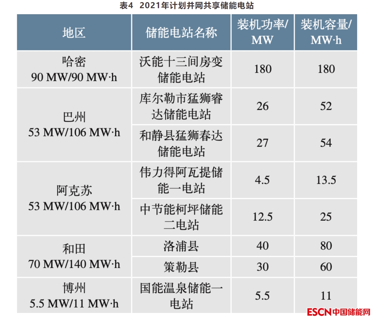 新疆推進(jìn)的儲能模式為電源側(cè)的“新能源+儲 能”運(yùn)營模式和“單體+共享”儲能模式,目前在新疆電網(wǎng)已接入發(fā)電側(cè)儲能電站6座,全部在南疆地區(qū),共計6萬kW/12.3萬kW·h,均為光伏電站內(nèi)集中布置。2021年計劃在博州、哈密、烏魯木齊、和田、阿克蘇和巴州地區(qū)投運(yùn)9座儲能電站,見表4。