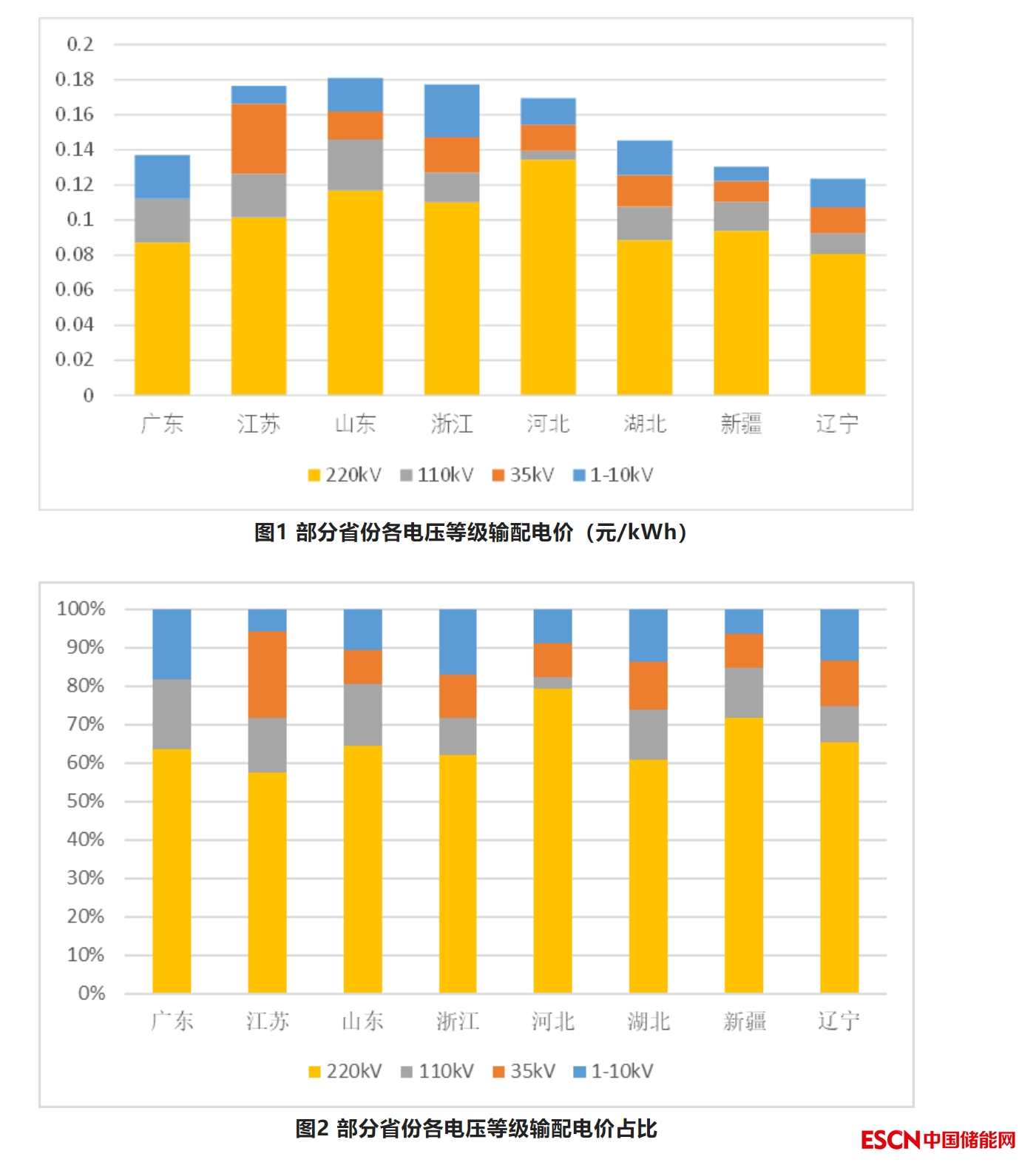 現(xiàn)今發(fā)布的輸配電價中,配電業(yè)務(110kV及以下)對應部分電價較低,也導致增量配電盈利難的問題。我國尚沒有實現(xiàn)輸電業(yè)務和配電業(yè)務分離,輸電價格與配電價格的核算難以做到透明,尤其以省級電網(wǎng)為單位進行核定時,企業(yè)的人力成本、管理費用、其他費用等如何在不同電壓等級進行分攤影響各電壓等級電價的合理性,當前電壓等級的差價并不足以反映配電業(yè)務的實際成本。圖1、圖2顯示了部分省份輸配電價構(gòu)成(兩部制),配電網(wǎng)部分的占比僅在30%-40%。增量配電企業(yè)由于其規(guī)模效應更小,管理費用分攤壓力更大,相較省級電網(wǎng)公司能在全省層面均衡成本,增量配電企業(yè)通過配電網(wǎng)較低的輸配電價實現(xiàn)盈利難度更大。