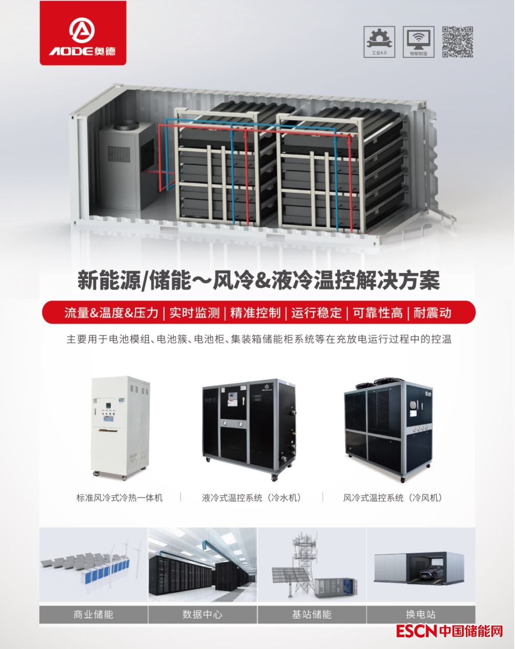 儲(chǔ)能電池工作中會(huì)持續(xù)性地釋放熱量,最佳工作溫度區(qū)間為10~35℃,當(dāng)溫度低于-20℃時(shí),電解液可能會(huì)凝固,從而阻礙鋰離子的流動(dòng),而當(dāng)溫度超過(guò) 60℃時(shí)對(duì)電芯造成潛在破壞,嚴(yán)重時(shí)將引發(fā)著火爆炸安全事故。奧德依托近20年的工業(yè)溫度控制經(jīng)驗(yàn)、強(qiáng)大的研發(fā)和技術(shù)團(tuán)隊(duì),快速響應(yīng)組建針對(duì)儲(chǔ)能行業(yè)的溫度控制系統(tǒng)解決方案的團(tuán)隊(duì),聚焦儲(chǔ)能安全,護(hù)航儲(chǔ)能產(chǎn)業(yè)穩(wěn)步發(fā)展,推出儲(chǔ)能行業(yè)風(fēng)冷系列和液冷系列溫控產(chǎn)品,溫控范圍:-40℃~+60℃,采用國(guó)際一線品牌壓縮機(jī),可實(shí)現(xiàn)智能化溫度調(diào)節(jié)和流量監(jiān)視,且產(chǎn)品結(jié)構(gòu)緊湊、運(yùn)行穩(wěn)定、耐震動(dòng)、穩(wěn)定性高、安裝方便,主要應(yīng)用于電池模組,電池簇,電池柜,集裝箱儲(chǔ)能柜系統(tǒng)等在充放電運(yùn)行過(guò)程中的控溫,運(yùn)用場(chǎng)景主要為:實(shí)驗(yàn)室,大型儲(chǔ)能站、商業(yè)儲(chǔ)能、數(shù)據(jù)中心、汽車換電站等。