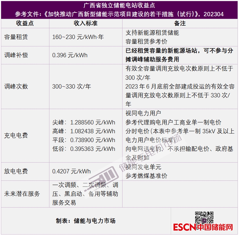4月4日,廣西發(fā)改委發(fā)布的《加快推動(dòng)廣西新型儲能示范項(xiàng)目建設(shè)的若干措施(試行)》,再次重申了容量租賃160-230元/kWh·年,調(diào)峰補(bǔ)償0.396元/kWh,最少調(diào)用次數(shù)300次/年的市場機(jī)制。